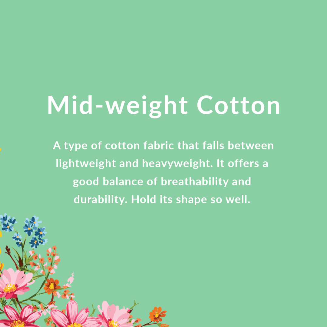 Medium-weight cotton is a versatile fabric that provides a good balance of durability and comfort, with a typical weight ranging from about 140-215 g/m² (5-8 oz/yd²). It is neither too thin nor too thick, making it suitable for a wide variety of projects, from clothing like shirts, skirts, and lightweight jackets.